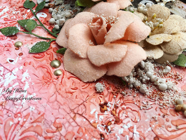 I used a chipboard album consisting of four little pages that I covered with white gesso, added texture with modelling paste and stencil and then applied color using Lindy's spray.